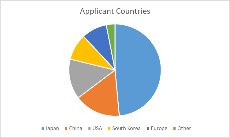 There have been slight declines in the number of patent families originating from Japan and the USA, but these have been matched by a rapid increase in the number of patent families originating in China. This increase matches a general increase in overall patent applications from China, as well as a clear strategy to promote hydrogen energy, including targets for fuel cell vehicles.