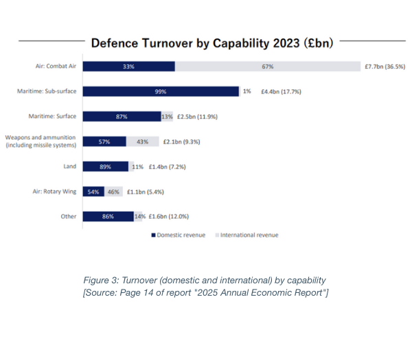 Domestic defence turnover also increased in 2023 (page 13 of the report), with a 15% increase on 2022. Domestically, the largest customer is the UK MoD ([Ministry of Defence] £14bn), but other government departments (£1.1bn), and industry or business-to-business sales (£0.9bn), accounted for a further £2bn in sales. The share of domestic turnover increased slightly from 2022 to 2023, too.