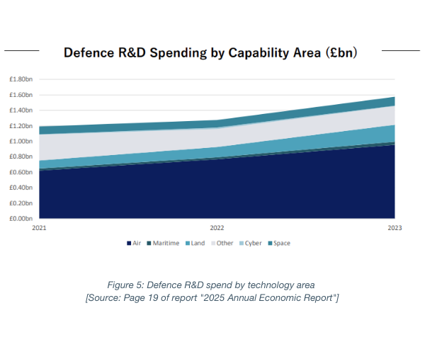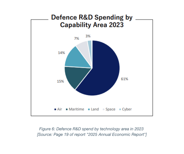 At page 20 the report considers Research and Development (R&D) expenditure by the respondents, for the period 2021-2023, by technology area. As shown in Figure 5 below, R&D expenditure in air capabilities has seen significant growth but the most significant proportional growth is attributable to land vehicles (112% growth from 2021 to 2023).
