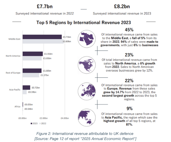 At page 12 the report includes a figure (copied below as Figure 2) illustrating international revenues generated by the survey respondents. Total international revenue is up from £7.7bn in 2022 to £8.2bn in 2023. The Middle East region is by far the largest contributor to these revenues, although Middle East revenue has decreased slightly (~5%) in 2023 relative to 2022. 94% of sales to the Middle East are to governments, a significant share. Exports to North America and Europe also saw growth between 2022 and 2023 (6% and ~15% respectively). I expect we will see continued growth of European exports, and possibly reduced growth of North American exports, in the future.