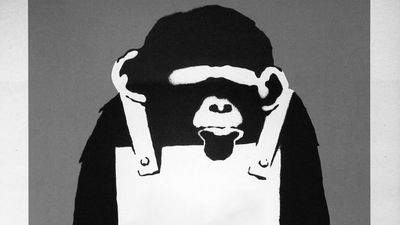 Banksy's mark representing his 2002 graffiti of a monkey strapped with a blank sign, which in the original artwork reads "Laugh now, but...