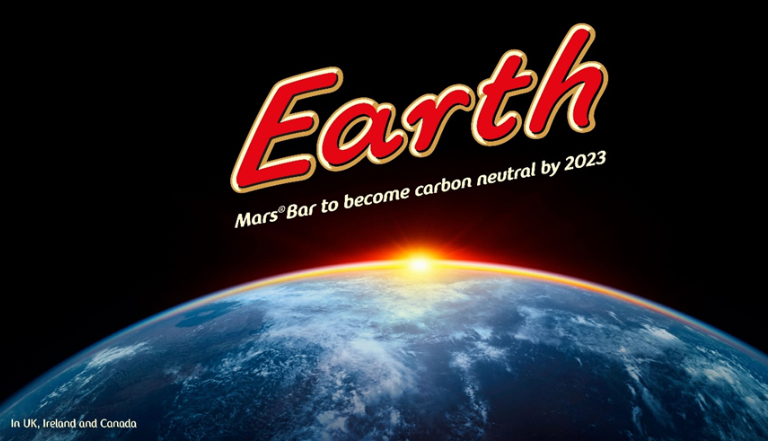 可以看出,“Earth”一词与玛氏巧克力棒包装和广告材料上的“Mars”品牌名称的字体相同,从而强化Mars的品牌形象: